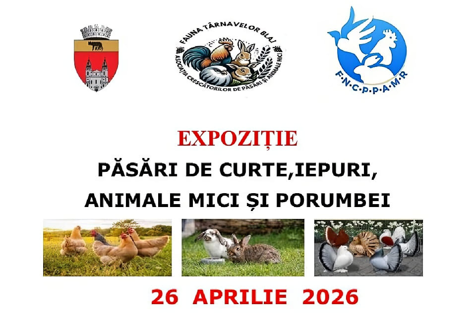 Duminică, 26 aprilie 2026, Asociația Crescătorilor de Păsări și Animale Mici „Fauna Târnavelor” Blaj organizează o nouă expoziție de păsări de curte, iepuri, animale mici și porumbei. Evenimentul va avea loc în Piața Mare Agroalimentară din municipiul Blaj, între orele 08:00 – 12:00.