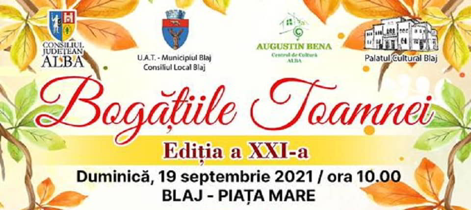 Ediția a XXI-a a „Bogățiilor Toamnei la Blaj” este organizată de Consiliul Județean Alba, Primăria și Consiliul Local Blaj, Centrul de Cultură „Augustin Bena” Alba și Palatul Cultural Blaj.