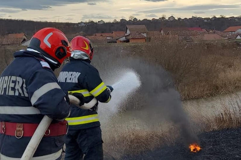 Intervenție a pompierilor din Blaj pentru stingerea unui incendiu de vegetație uscată, izbucnit pe malul râului Târnava