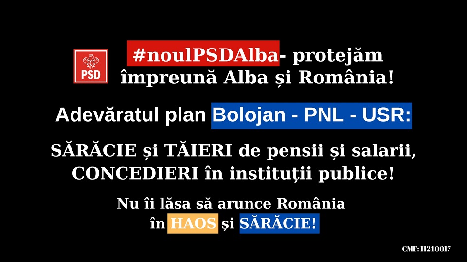 Comandat de Partidul Social Democrat- Organizația Județeană Alba / Executat de UNIREA PRES SRL – portal online: https://www.blajinfo.ro. Cod mandatar financiar coordonator: 11240017