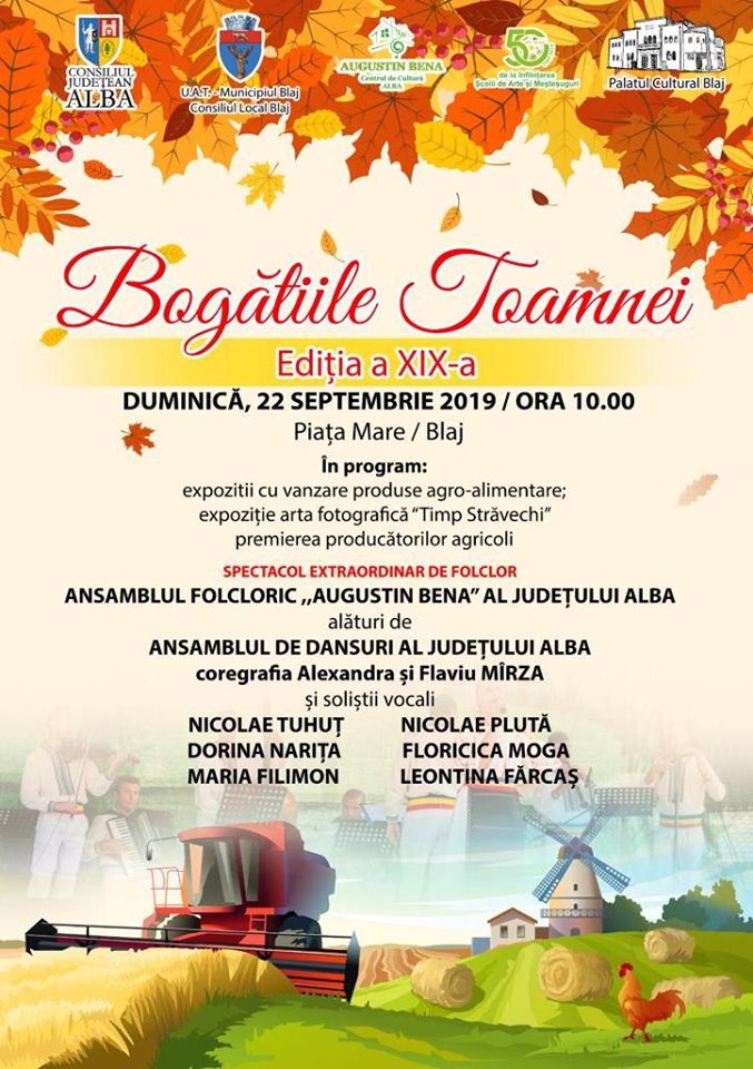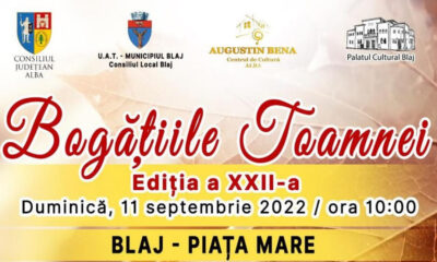 Cea de a XXII-a ediţie a manifestării „Bogăţiile Toamnei” la Blaj se va desfășura duminică, 11 septembrie 2022, în Piaţa Mare Agroalimentară. Organizatorii vor oferi producătorilor...