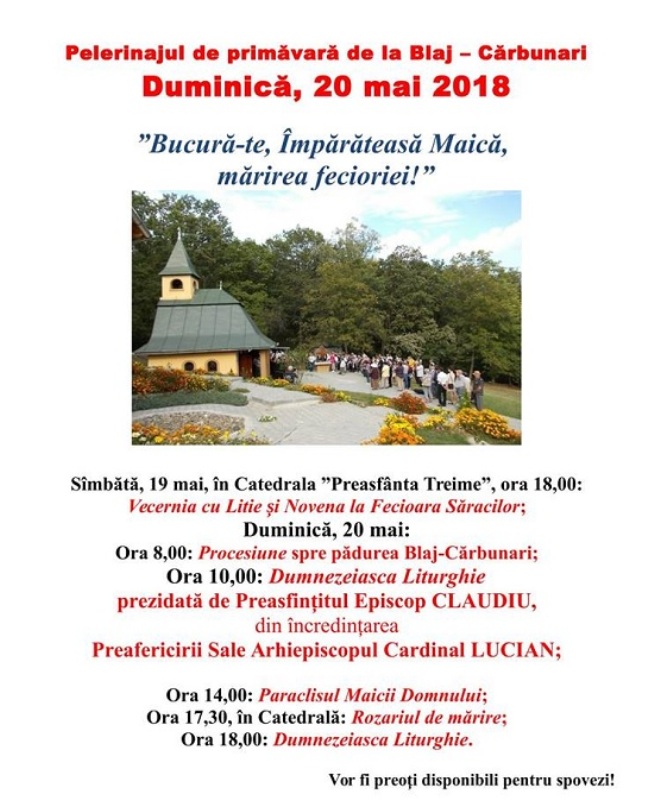 Mâine, 20 mai 2018, va avea loc pelerinajul de primăvară la Sanctuarul Fecioara Săracilor din pădurea Cărbunari, în apropiere de Blaj. Programul pelerinajului va începe sâmbătă...