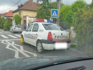 Unui autoturism de poliție Dacia Logan i-au fost blocate roțile de către Poliția Locală, pentru că a fost parcat neregulamentar, chiar lângă o trecere de pietoni aflată în apropierea sediului de Poliție din Blaj.